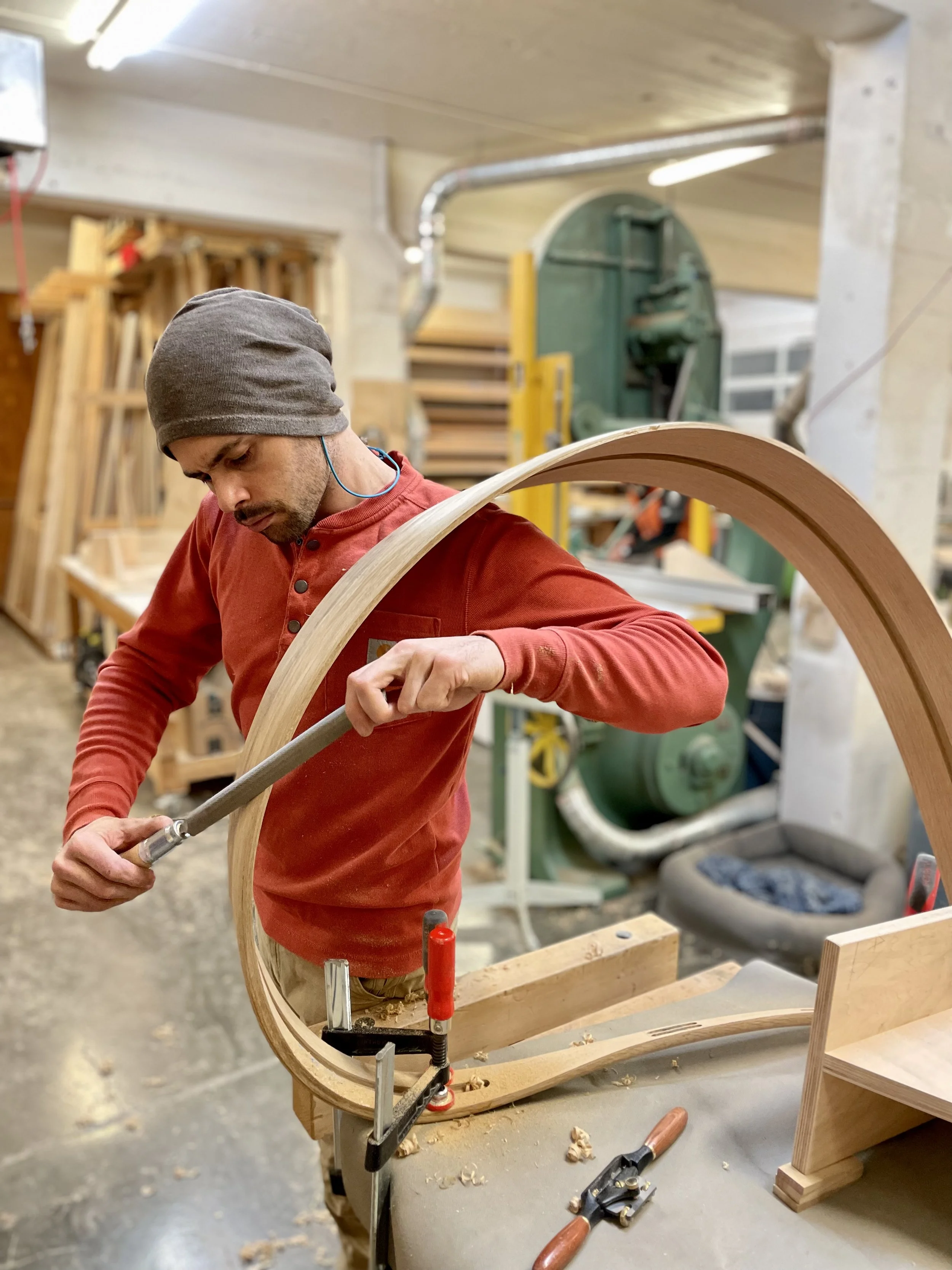 My work is created by sequentially deconstructing and then reconstructing layers of wood while bending them into free flowing compositions. I hand sculpt the entire length of each piece using files, rasps, hand planes, spokeshaves, and scrapers. As I continue to develop this work, I conduct experiments with varying degrees of success. Wood is a complex, organic substance with inherent properties. Its anatomy and breaking points inform and persuade the work’s overall compositions. The innovation in creating this work lies in the unconventional thinking required to discover and refine processes that both overcome and honor the wood's suggestive nature, while at the same time conceptualizing new and unique artistic forms within my medium.